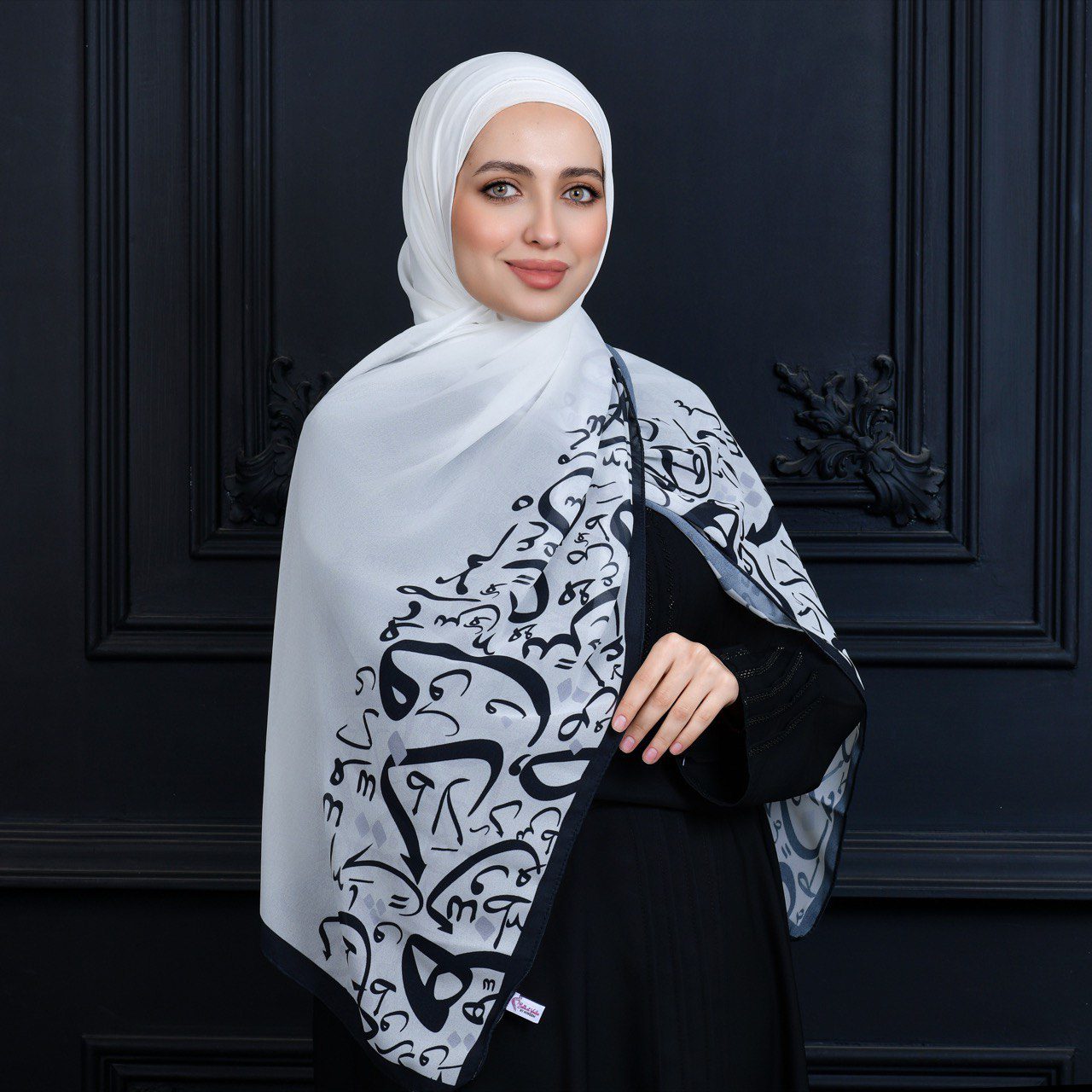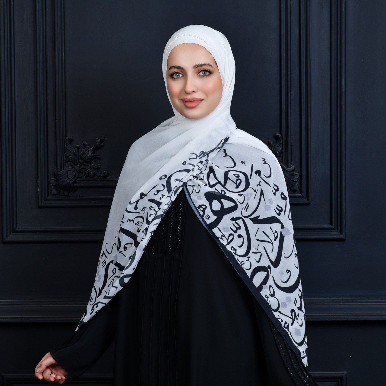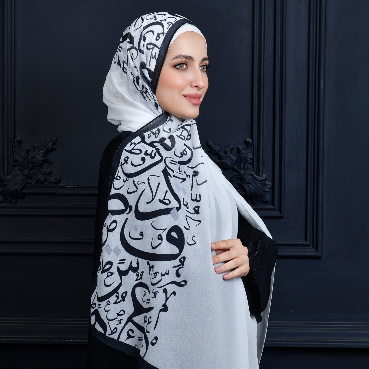 Signé Belle et Voilée by Nisreen, ce hijab incarne un savoir-faire soigné où chaque détail compte. Son motif de lettres arabes noires affirme une identité forte, entre modernité graphique et inspiration orientale.